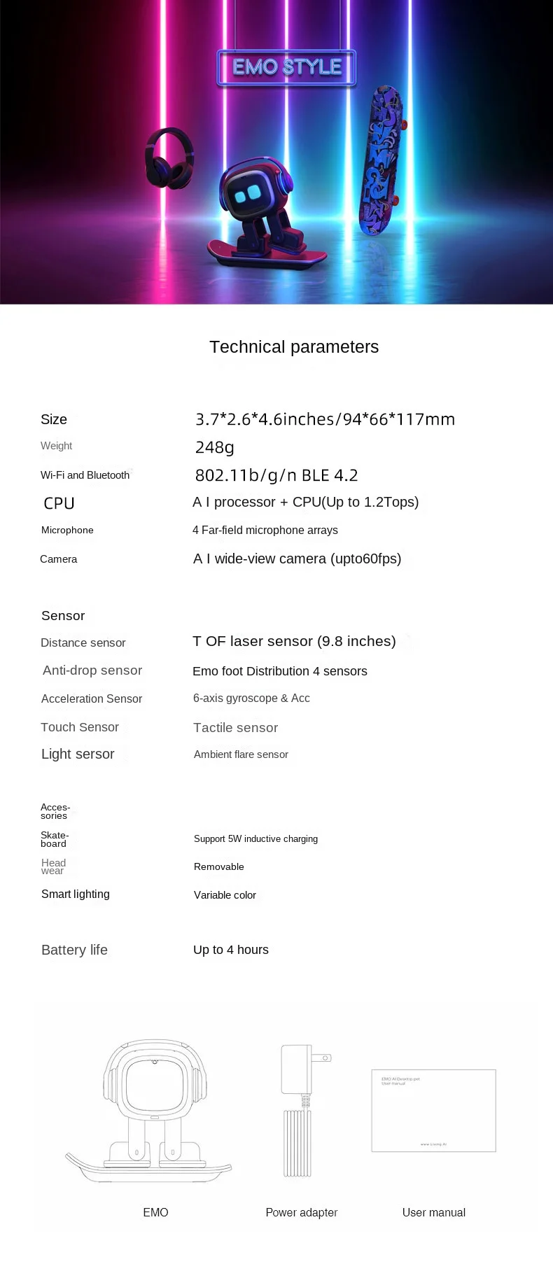 High-concerned chemical: None Is Electric: Lithium Battery Gender: Unisex Item Type: Toy Cameras Material: Plastic Features: Battery Operated,Flashing,Sounding Origin: Mainland China Recommend Age: 3-6Y,6-12Y,14+y Certification: CE Official Authentic: yes Original packaging: yes Transport: Free Shipping Color: White Port: USB Type-C Wireless charging: Skateboard or charging station Battery life: 4 hours Charging time: 2 hours GPT: Support GPT voice dialogue WIFI / BLE: 802.11b/g/n BLE4.2 Charging station: Low battery automatic recharge Functions 0: Intelligent Voice Functions 1: Facial…